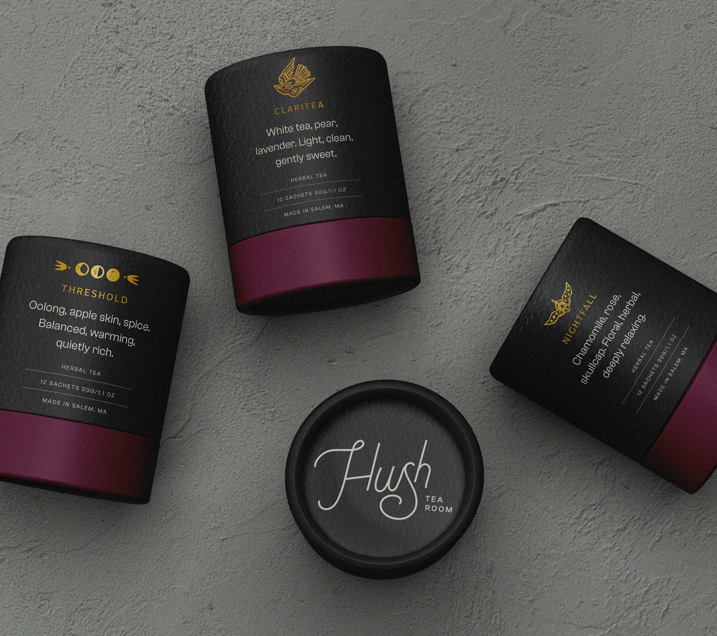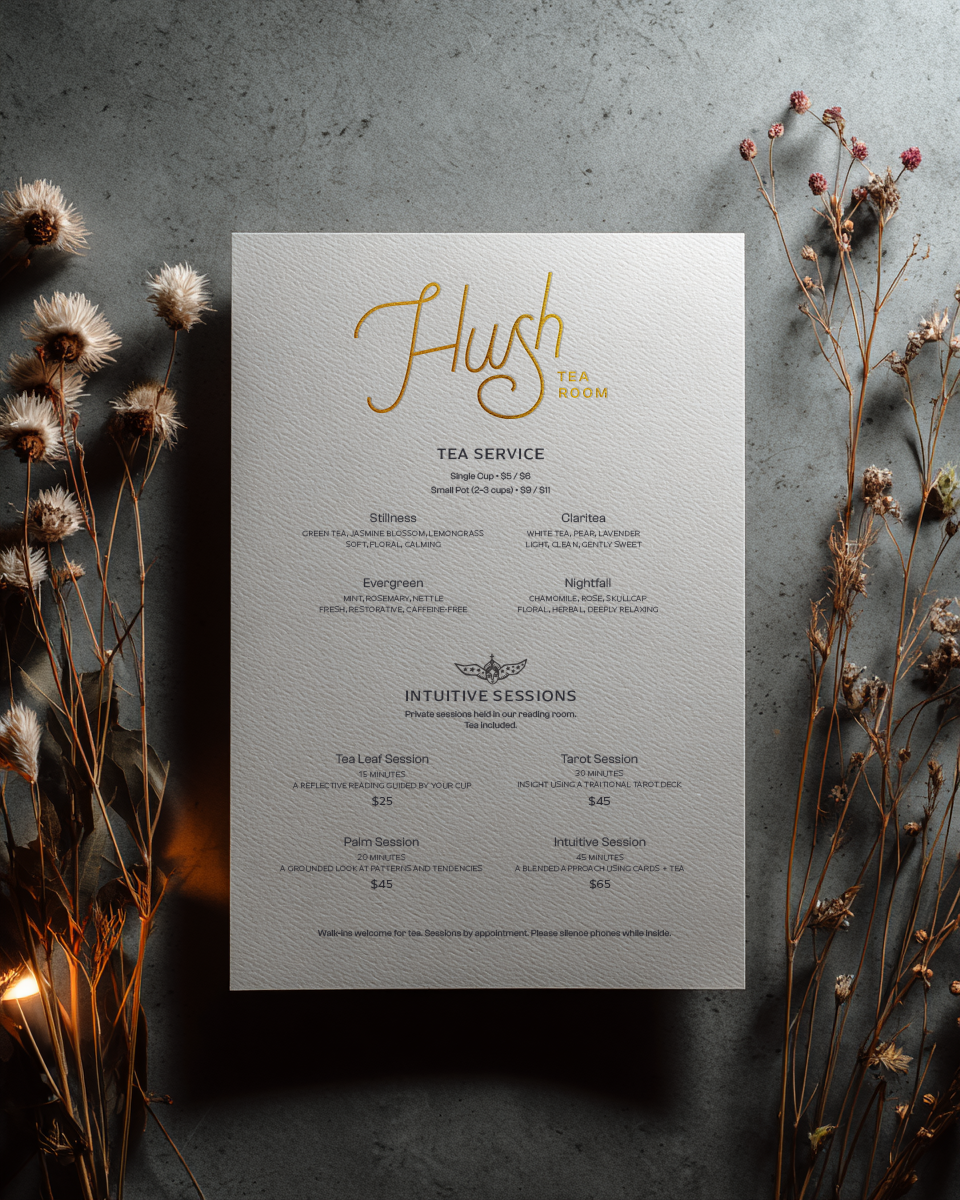 Hush is a conceptual brand identity for an intimate tea room offering loose-leaf teas alongside private intuitive sessions. Designed as a small, cozy space in coastal New England, the project explores how branding can support slow rituals — whether that means ordering a cup of tea, settling into a corner, or booking a quiet, reflective experience.