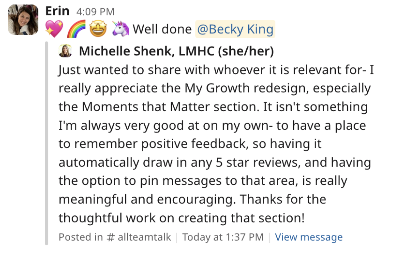 The founder praised it as a thoughtful reflection of company values. Therapists shared excitement in team meetings, calling it “the first feature that really feels made for us.” Slack threads filled with appreciation from clinicians and leadership alike.